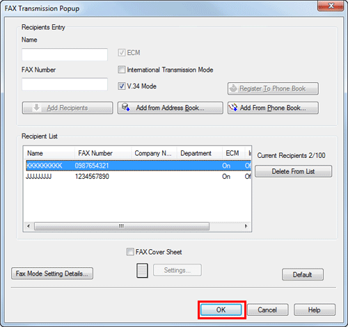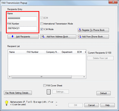 6. Set the recipient name and fax number.