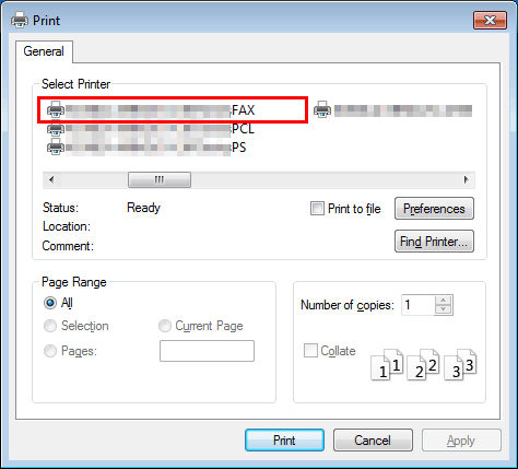 2. Check that the fax driver of this machine is selected in [Printer Name] (or [Select Printer]).